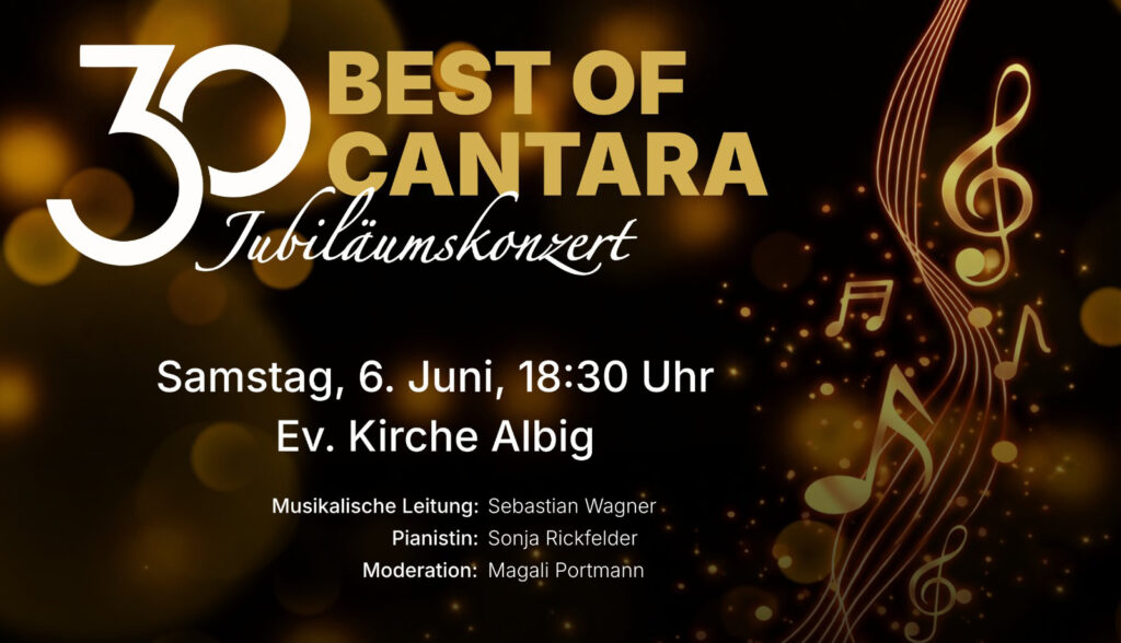 Das Jubiläumskonzert findet am 6. Juni 2026 um 18:30 Uhr in der stimmungsvollen Kirche in Albig statt. Unter dem Motto „Best of Cantara“ erwartet Sie ein festliches Programm, das die musikalischen Höhepunkte und Lieblingsstücke aus drei Jahrzehnten Chorarbeit präsentiert. Freuen Sie sich auf bekannte Melodien, berührende Momente und einige überraschende musikalische Einlagen, die diesen Abend zu einem unvergesslichen Erlebnis machen werden.